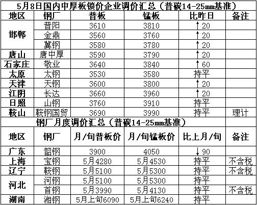 5月8日国内中厚板钢厂调价汇总5月8日国内中厚板钢厂调价汇总