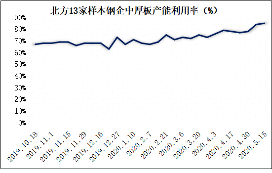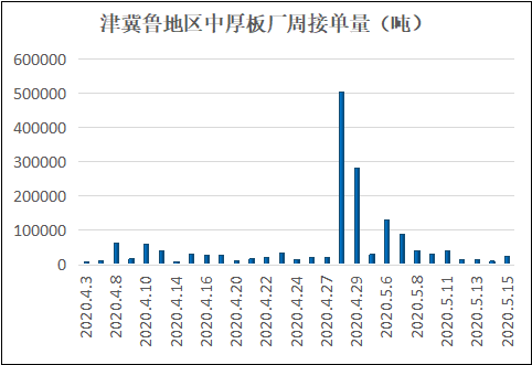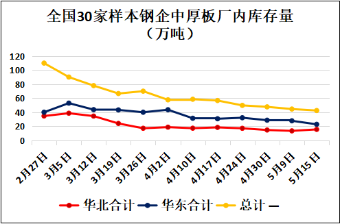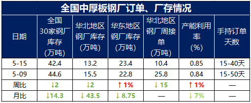 以下为具体指标表现情况: 钢厂库存继续保持下降态势:全国中厚板钢厂厂内库存自4月初见顶后,持续保持下降态势,5月份各厂的库存已基本回归到价常规水平,其中尤其以华东地区的库存表现最为突出。本周(5月15日)全国30家样本中厚板钢材生产企业厂内中厚板库存量42.44万吨,比上周(5月09日)下降2万吨。其中华北12家钢企中厚板厂库13.2万吨,比上周下降2.3万吨;华东9家钢企中厚板厂库23.44万吨,比上周增加0.68万吨。 本周国内中厚板生产企业手持订单情况保持良好:截至5月15日,国内中厚板生产企业手持订单天数:一线企业手持订单天数保持在30-40天左右,二线企业基本保持在20-30天左右,少部分企业叠加月底后结算的协议量能够保持在15天左右。总体手持订单情况继续保持良好。本周津晋冀鲁豫钢厂中厚板产能利用率小增:本周(5月15日)北方13家样本钢企中板日产量8.09万吨,轧线产能利用率85%,周环比增1个百分点。本周1条轧线增产。其他基本处于满产状态。 钢厂周接订单情况:本周(5月15日)北方13家样本钢企中板周接订单量10.4万吨,较上周(5月09日)周接单量下降15.4万吨。 |