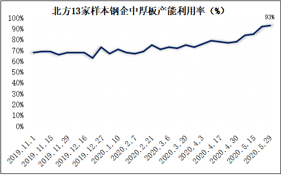 兰格调研:本周(5月29日)北方13家样本钢企中板日产量8.79万吨,轧线产能利用率93%,周环比增1个百分点。本周1条轧线增产。其他基本处于满产状态。