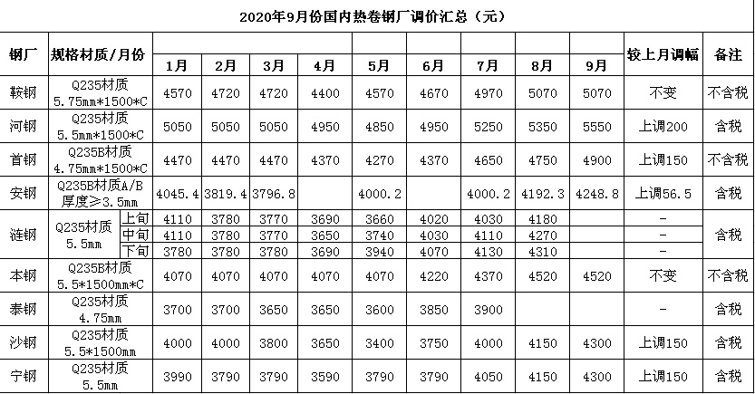 2020年9月份国内热卷钢厂调价汇总