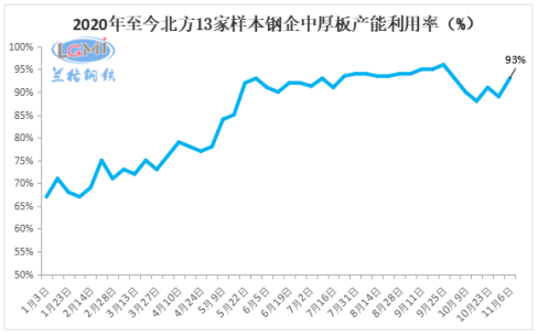本周(11月6日)北方13家样本钢企中板日产量8.85万吨,轧线产能利用率93%,周环比增4个百分点,各个钢企基本处于正常生产状态。