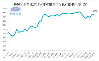 本周(11月13日)北方13家样本钢企中板日产量8.9万吨,轧线产能利用率93%,与上周基本持平,各个钢企基本处于正常生产状态。