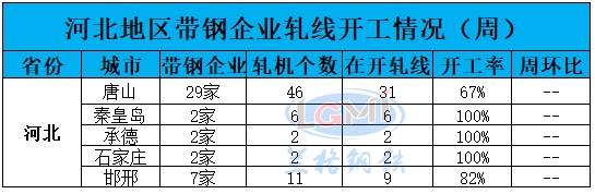 其中唐山地区有轧机46个,在开工轧线31条,开工率为67%,邯邢地区有轧机11个,在开工轧线9条,开工率为82%,而秦皇岛、承德、石家庄地区轧机全开,满线生产。