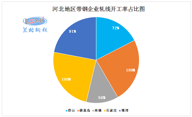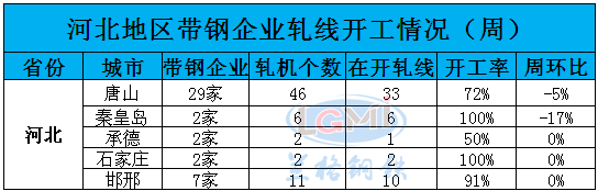 其中唐山地区有轧机46个,在开工轧线33条,开工率为72%,邯邢地区有轧机11个,在开工轧线10条,开工率为91%,而秦皇岛、承德、石家庄地区轧机有10个,在开9条。
