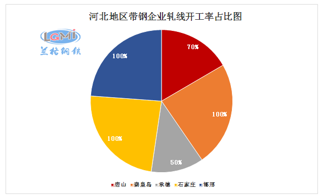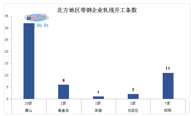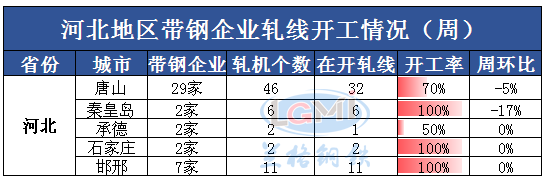 其中唐山地区有轧机46个,在开工轧线32条,开工率为70%,邯邢地区有轧机11个,在开工轧线11条,开工率为100%,而秦皇岛、承德、石家庄地区轧机有10个,在开9条。