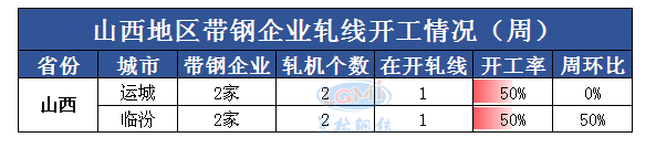 据兰格云商调研监测:本周五(12月31日)兰格网对山西地区4家带钢企业进行了开工情况调查,调查显示,山西地区带钢轧机共有4个,在开工轧线2条,开工率为50%。其中运城轧机有2个,在开工轧线1条,开工率为50%;临汾轧机2个,在开工轧线1条,开工率为50%。