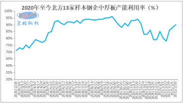 兰格调研:本周(2月20日)北方13家样本钢企中板日产量8.6万吨,轧线产能利用率90%,周环比增2个百分点,本周多数钢企基本继续保持正常生产。