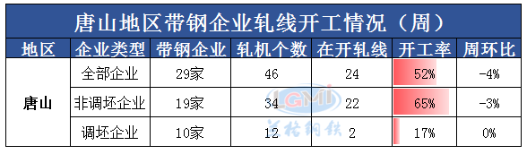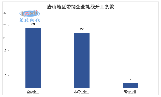 据兰格云商调研监测:本周五(3月5日)兰格网对唐山地区29家带钢企业进行了开工情况调查,调查显示,唐山地区带钢轧机共有46个,本周在开工轧线24条,较上周减少1条,开工率为52%,较上周环比下降2%。其中非调坯带钢轧机有34个,本周在开工轧线22条,较上周减少1条,开工率为65%,较上周环比下降3%。调坯带钢轧机12个,本周在开工轧线2条,较上周持平,开工率为17%,较上周环比持平。
