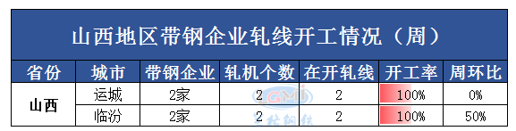 据兰格云商调研监测:本周五(3月5日)兰格网对山西地区4家带钢企业进行了开工情况调查,调查显示,山西地区带钢轧机共有4个,本周在开工轧线4条,较上周增加1条,开工率为100%,较上周增长25%。其中运城轧机有2个,本周在开工轧线2条,开工率为100%;临汾轧机2个,本周在开工轧线2条,开工率为100%。