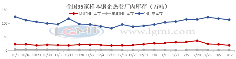 兰格调研:据兰格云商平台监测数据显示本周35家样本钢企热卷库存114万吨,较上周同期减少4万吨