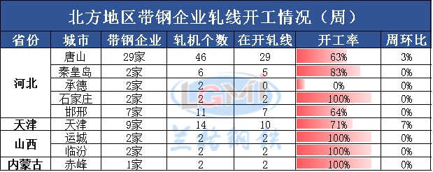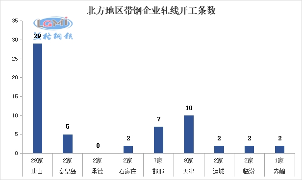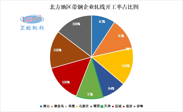 据兰格云商调研监测:本周五(4月16日)兰格网对北方地区56家带钢企业进行了开工情况调查,调查显示,北方地区带钢轧机共有87个,本周在开工轧线59条,较上周增加3条,本周开工率为67.8%,较上周环比增长2.7%。其中非调坯带钢轧机有75个,本周在开工轧线49条,较上周增加2条,本周开工率为65.3%,较上周环比增长1.8%。调坯带钢轧机12个,本周在开工轧线10条,较上周增加1条,开工率为83.3%,较上周增加8.3%。