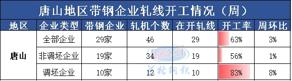据兰格云商调研监测:本周五(4月16日)兰格网对唐山地区29家带钢企业进行了开工情况调查,调查显示,唐山地区带钢轧机共有46个,本周在开工轧线29条,较上周增加2条,开工率为63%,较上周环比增加3%。