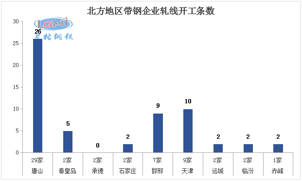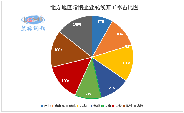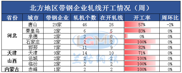 据兰格云商调研监测:本周五(4月30日)兰格网对北方地区56家带钢企业进行了开工情况调查,调查显示,北方地区带钢轧机共有87个,本周在开工轧线58条,较上周减少1条,本周开工率为66.1%,较上周环比下降1.1%。其中非调坯带钢轧机有75个,本周在开工轧线52条,较上周减少1条,本周开工率为69.3%,较上周环比下降1.4%。调坯带钢轧机12个,本周在开工轧线6条,较上周持平,开工率为50%,较上周环比持平。