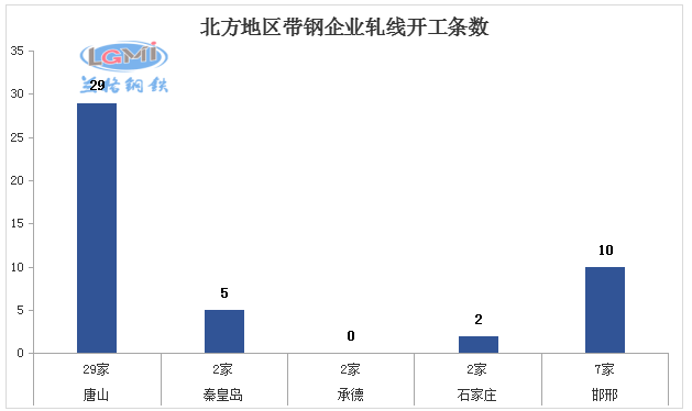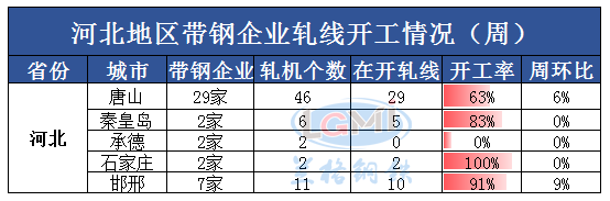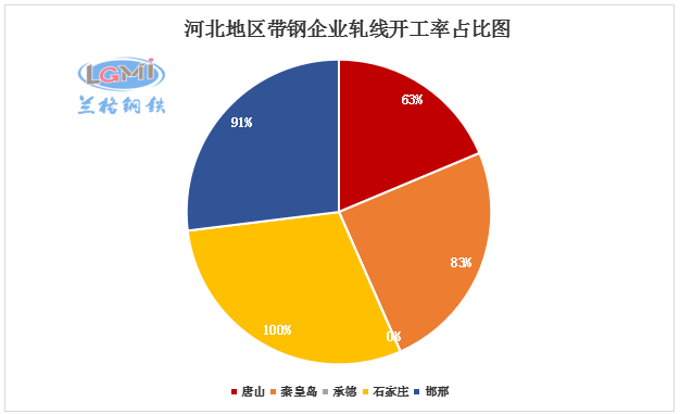 据兰格云商调研监测:本周五(5月7日)兰格网对河北地区42家带钢企业进行了开工情况调查,调查显示,河北地区带钢轧机共有67个,本周在开工轧线46条,较上周增加4条,开工率为69%,较上周环比上升6%。其中唐山地区有轧机46个,本周在开工轧线29条,较上周增加3条,开工率为63%,较上周环比上升6%。邯邢地区有轧机11个,本周在开工轧线10条,较上周增加1条,本周开工率为91%,较上周环比上升9%。秦皇岛地区开工率为83%,与上周持平,承德、石家庄地区轧机有4个,本周在开2条,较上周持平。