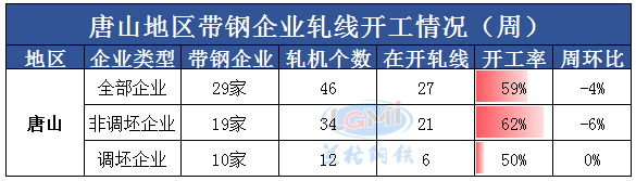 其中非调坯带钢轧机有34个,本周在开工轧线21条,较上周减少2条,开工率为62%,较上周环比下降6%。调坯带钢轧机12个,本周在开工轧线6条,较上周持平,开工率为50%,较上周持平。