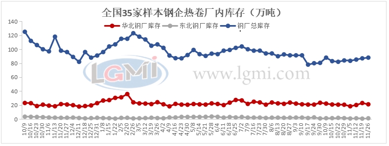 兰格调研:据兰格云商平台监测数据显示本周35家样本钢企热卷厂库88万吨,比上周同期增加1万吨。