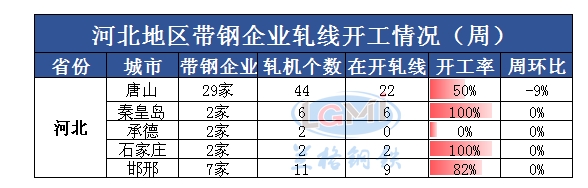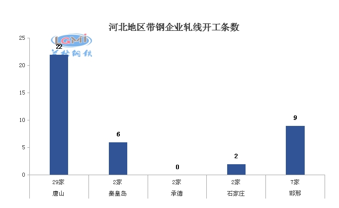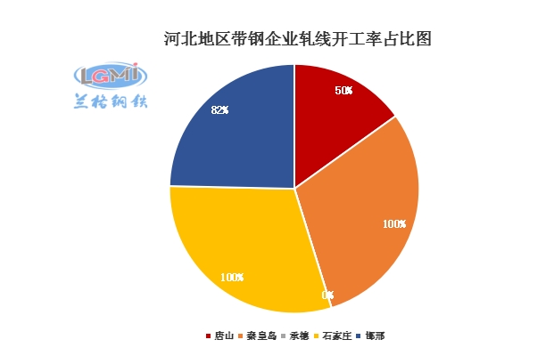 据兰格云商调研监测:本周五(1月28日)兰格网对河北地区42家带钢企业进行了开工情况调查,调查显示,河北地区带钢轧机共有65个,本周在开工轧线39条,开工率为60%,较上周下降6%。其中唐山地区有轧机44个,本周在开工轧线22条,开工率为50%,较上周下降9%。邯邢地区有轧机11个,本周在开工轧线9条,本周开工率为82%,较上周持平。秦皇岛地区开工率为100%,较上周上升持平。承德、石家庄地区轧机有4个,本周在开2条,较上周持平。