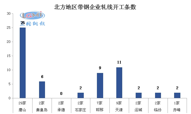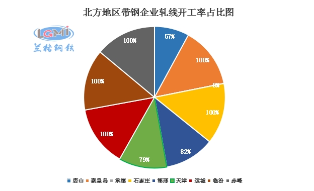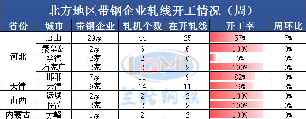 据兰格云商调研监测:本周五(2月6日)兰格网对北方地区56家带钢企业进行了开工情况调查,调查显示,北方地区带钢轧机共有85个,本周在开工轧线59条,本周开工率为69.4%,较上周上升3.5%。其中非调坯带钢轧机有73个,本周在开工轧线54条,本周开工率为74%,较上周下降1.4%。调坯带钢轧机12个,本周在开工轧线5条,开工率为41.7%,较上周上升33.4%。