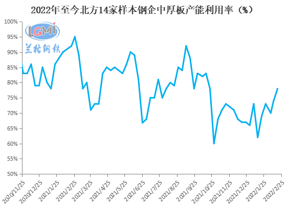 兰格调研:本周(2月25日)北方13家样本钢企中板日产量7.5万吨,轧线产能利用率78%,环比上周上升4%,大部分钢企产量并未达到满产状态。