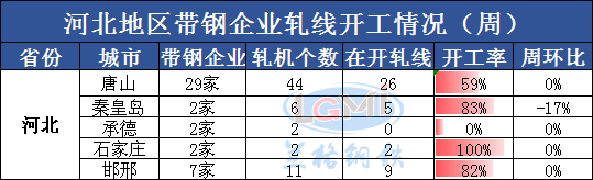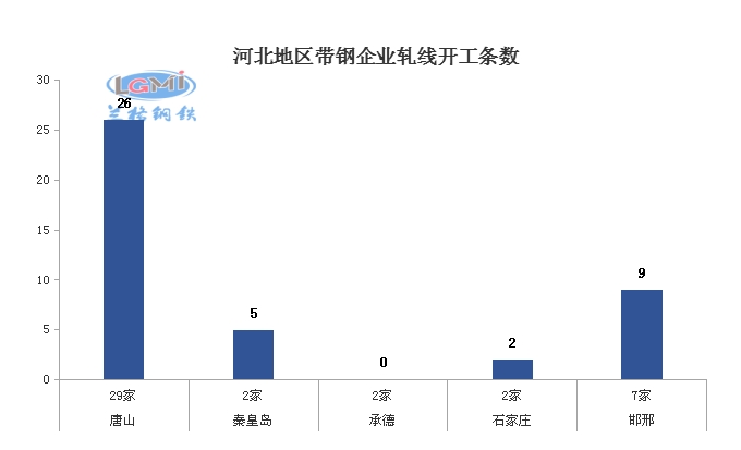 据兰格云商调研监测:本周五(3月11日)兰格网对河北地区42家带钢企业进行了开工情况调查,调查显示,河北地区带钢轧机共有65个,本周在开工轧线42条,开工率为65%,较上周下降1%。其中唐山地区有轧机44个,本周在开工轧线26条,开工率为59%,较上周持平。邯邢地区有轧机11个,本周在开工轧线10条,本周开工率为91%,较上周持平。秦皇岛地区开工率为83%,较上周上升降17%。承德、石家庄地区轧机有4个,本周在开2条,较上周持平。