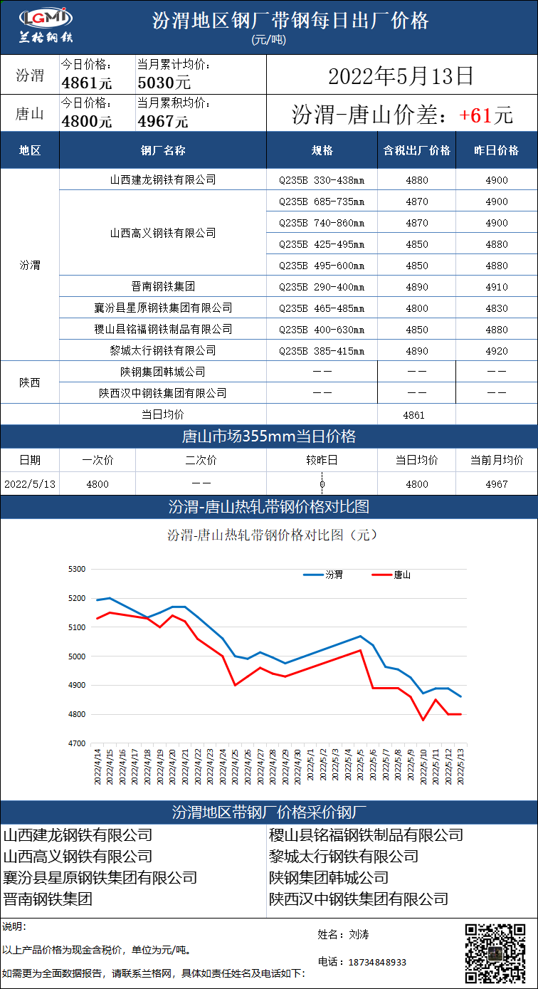 5月13日汾渭地区钢厂带钢出厂价格