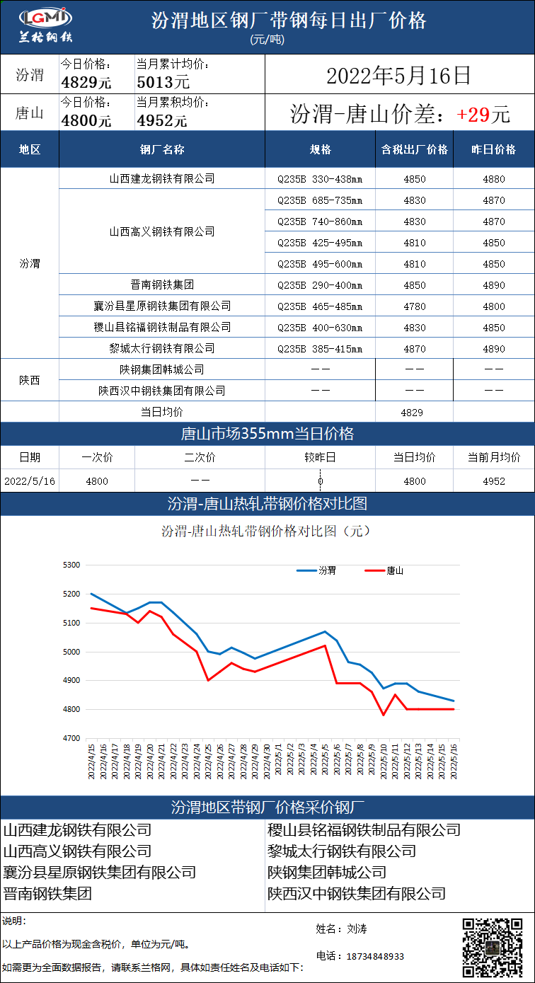 • 5月16日汾渭地区钢厂带钢出厂价格