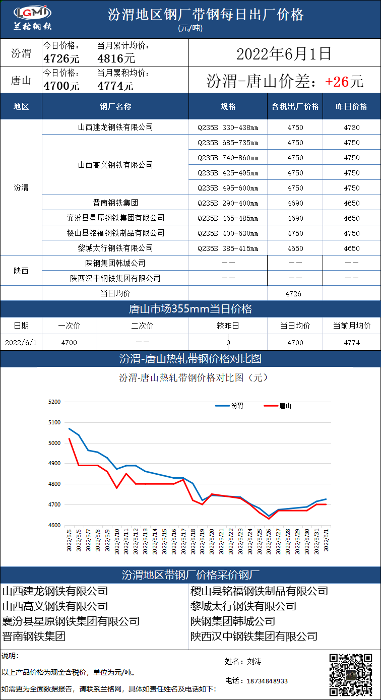 • 6月1日汾渭地区钢厂带钢出厂价格