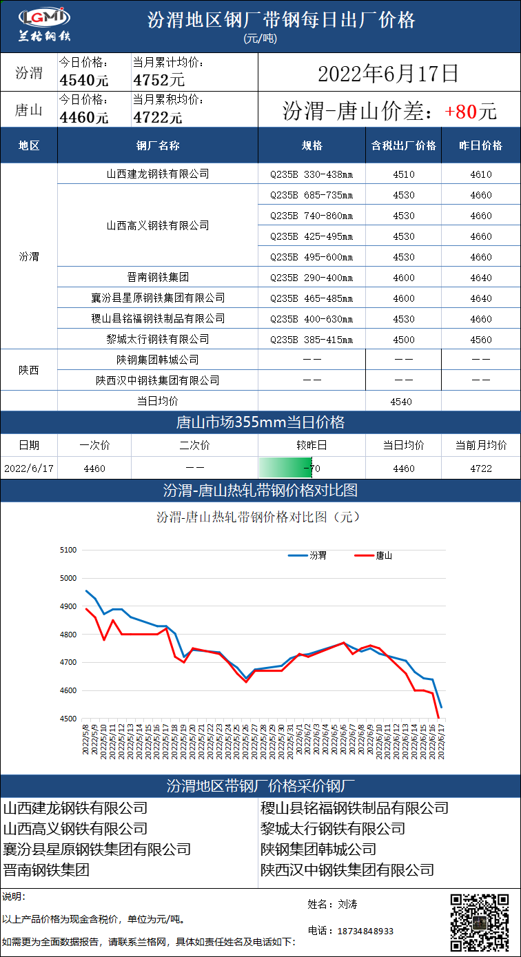 • 6月17日汾渭地区钢厂带钢出厂价格