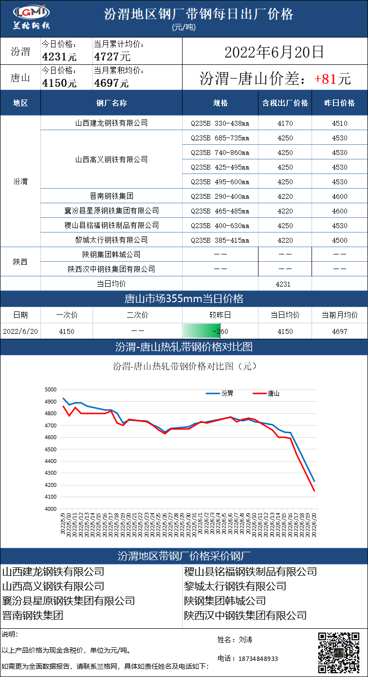 • 6月20日汾渭地区钢厂带钢出厂价格
