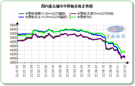 本周(7.18-7.22)国内中厚板市场价格走势不一,前期价格上涨,后期震荡下行,需求面一般。据兰格云商平台监测数据显示,国内重点城市16-25mm普板平均价格为4161元,较上个成交日下调8元,较上周同期涨28元,较上月同期下调481元。现主导城市方面,邯郸4080元(吨价,下同),上海4100元,天津4050元,广州4100元,西安4200元,武汉4150元,成都4380元。钢厂锁价方面大体守稳,普阳4100元,冀钢4100元,敬业4100元,天钢4070元,唐中厚4080元,华伟4060元。