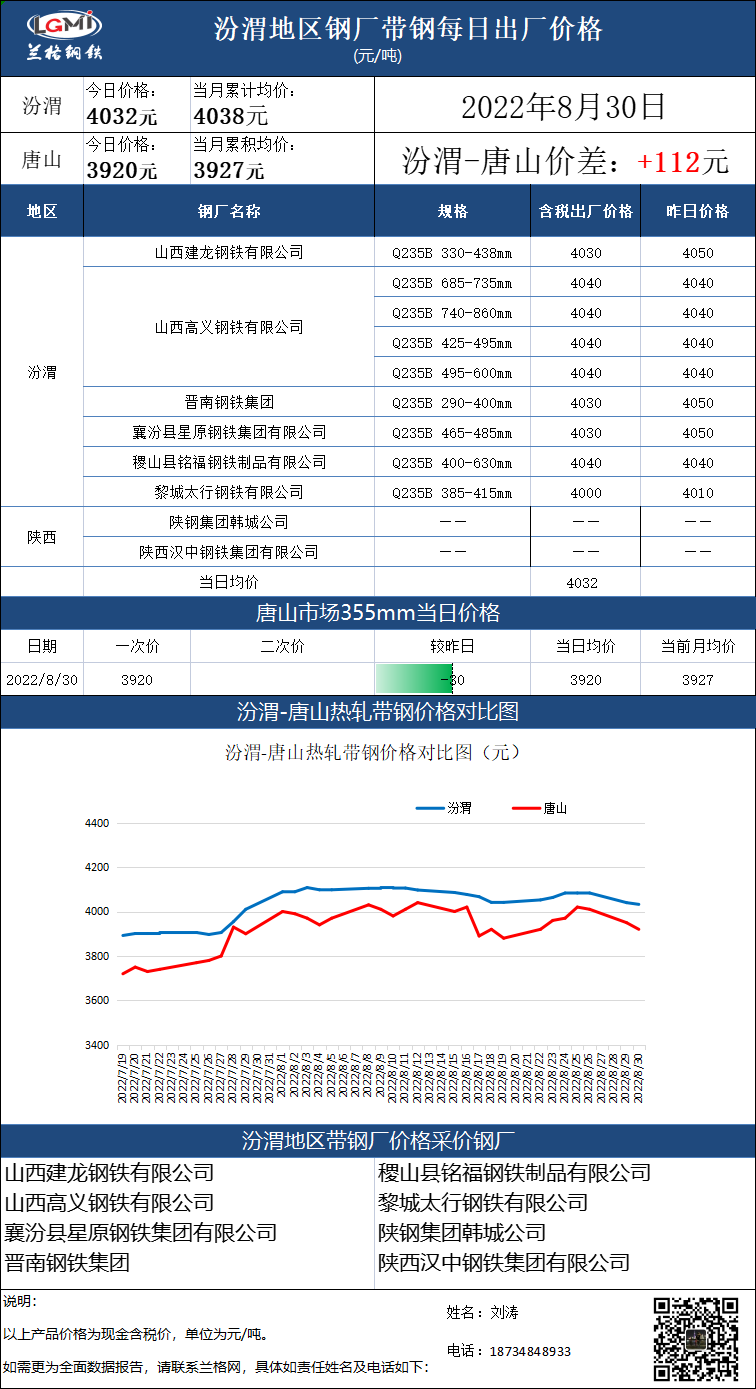 • 8月30日汾渭地区钢厂带钢出厂价格