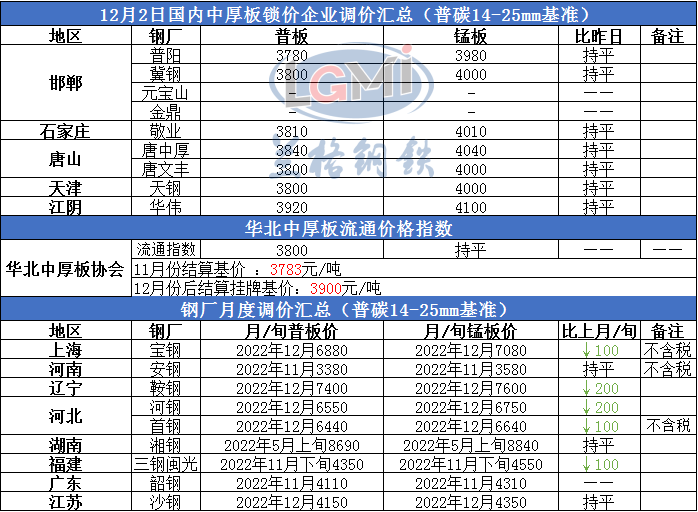 12月2日国内中厚板锁价企业调价汇总
