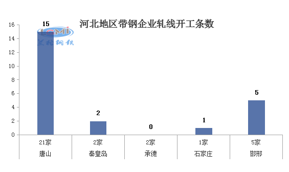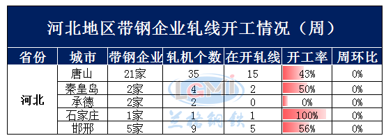 据兰格云商调研监测:本周(12月15日)兰格网对河北地区31家带钢企业进行了开工情况调查,调查显示,河北地区带钢轧机共有51个,本周在开工轧线23条,开工率为45%,较上周持平。其中唐山地区有轧机35个,本周在开工轧线15条,开工率为43%,较上周持平。邯邢地区有轧机9个,本周在开工轧线5条,本周开工率为56%,较上周持平。秦皇岛地区开工率为50%,较上周持平,承德、石家庄地区轧机有3个,本周在开1条。