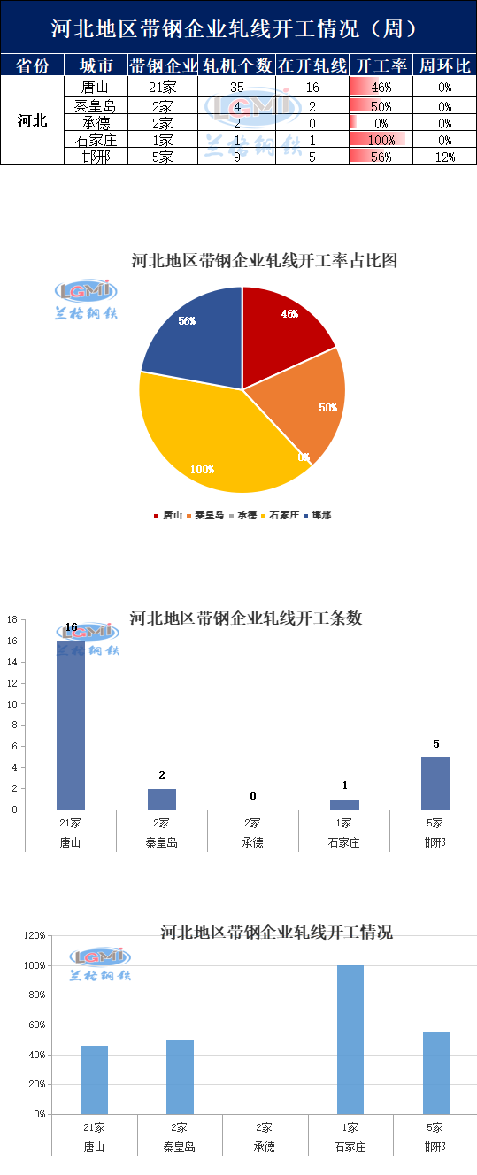 据兰格云商调研监测:本周(12月29日)兰格网对河北地区31家带钢企业进行了开工情况调查,调查显示,河北地区带钢轧机共有51个,本周在开工轧线24条,开工率为47%,较上周上升2%。其中唐山地区有轧机35个,本周在开工轧线16条,开工率为46%,较上周持稳。邯邢地区有轧机9个,本周在开工轧线5条,本周开工率为56%,较上周上升12%。秦皇岛地区开工率为50%,较上周持平,承德、石家庄地区轧机有3个,本周在开1条。