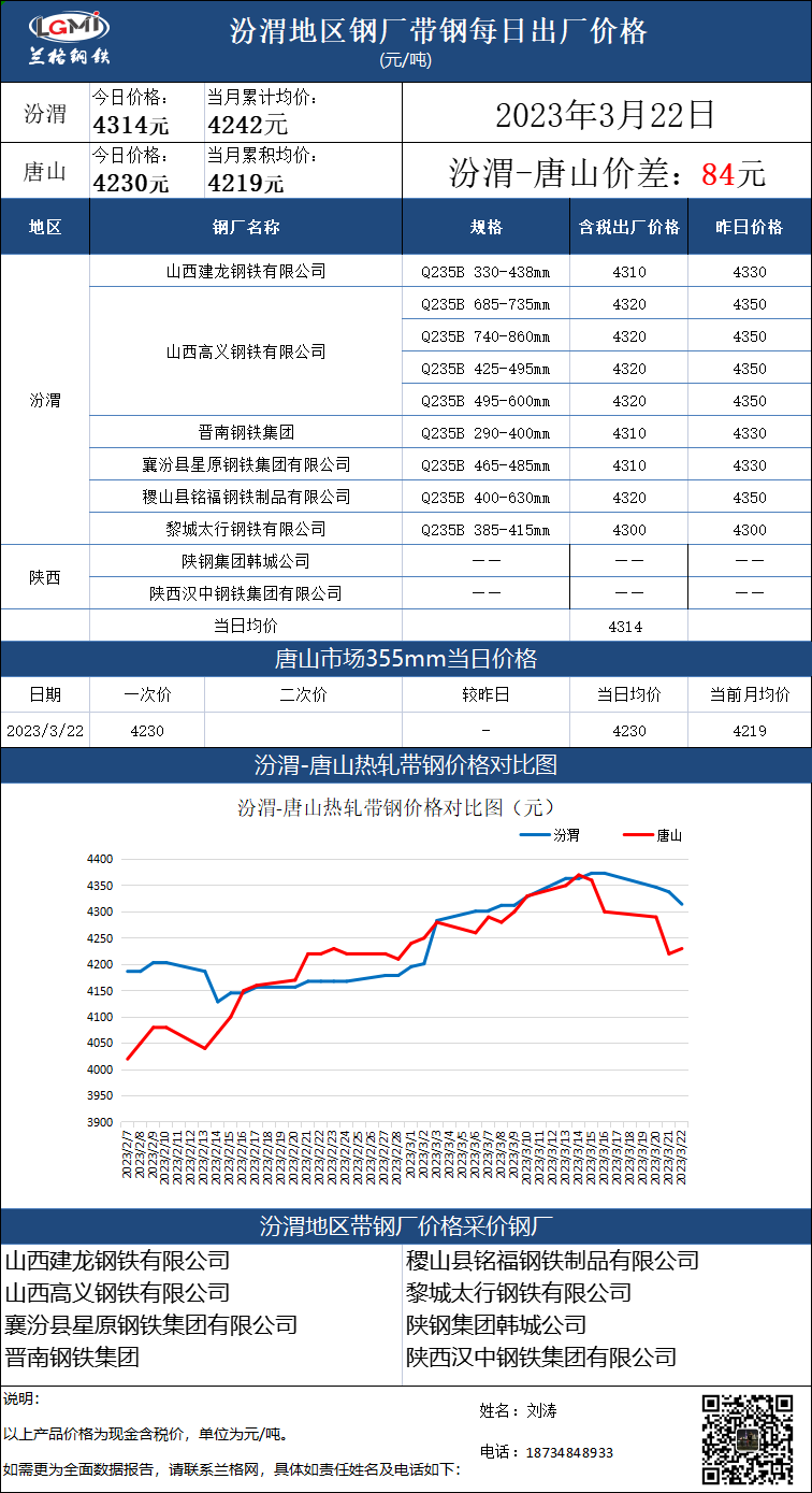 • 3月22日汾渭地区钢厂带钢出厂价格