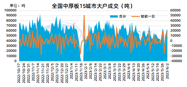 据兰格钢铁云商平台监测数据显示,6月2日全国15个重点城市中厚板大户日出货量约为63350吨,较上个成交日明显增加4090吨,其中北方区域邯郸中厚板大户出货量约15500吨,较上个成交日减少2300吨,南方区域江阴中厚板大户出货量为14000吨,较上个成交日增加3700吨;今日期货主力市场走高为主,拉动现货面部分区域价格走高,中厚板个别区域跟涨,但成交提升有限,买方观望心态较浓。