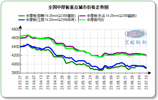 7月10日国内中厚板市场价格部分下滑,调整幅度在10-20元不等。据兰格云商平台监测数据显示,国内重点城市16-25mm普板平均价格为4042元,较上个成交日降16元,较上周同期降26元。