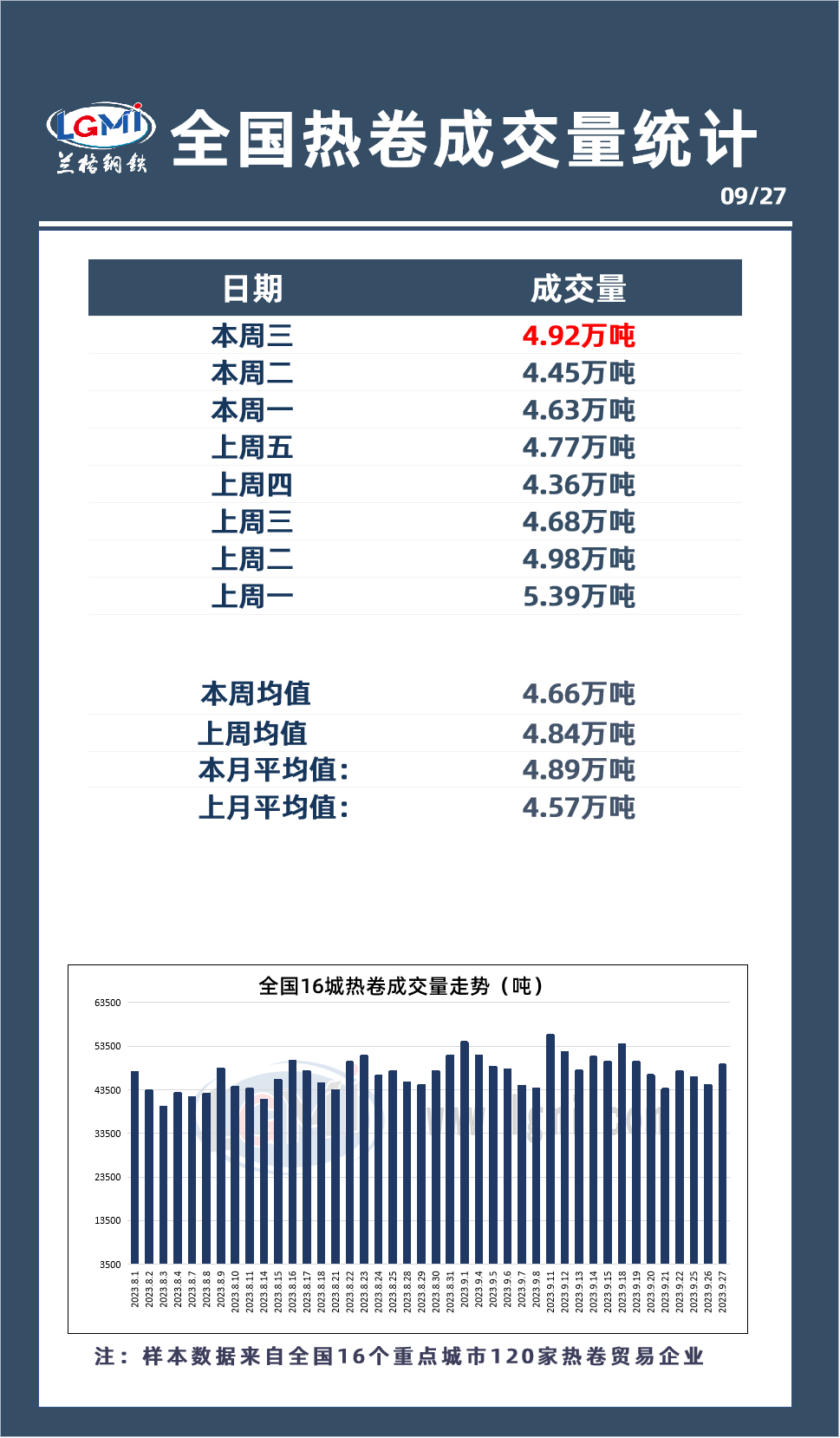 据兰格钢铁云商平台监测数据显示,9月27日全国16个重点城市热轧板卷大户日出货量约为49220吨,较昨日增加4840吨。其中北方区域唐山热轧板卷大户出货量约为6100吨,较昨日增加1700吨;南方区域杭州热轧板卷市场大户出货量约为4180吨,增加480吨。热卷期货盘面窄幅震荡,热卷市场部分下游以及终端入市存在少量补货行为,今日热卷大户出货量较昨日增加。