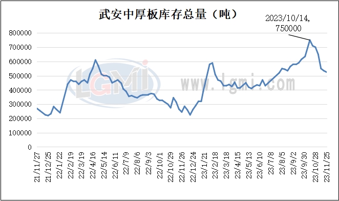 钢厂库存方面,据兰格云商平台监测的数据显示,1-11月份国内30家中厚板生产企业中厚板库存水平明显高于去年同期。截止到11月30日,全国30家中厚板库存总量为66.5万吨,较10月底下降5.2万吨,较年初下降1万吨。整体来看,年内钢厂中厚板库存最高值出现在1月下旬为84.5万吨,最低值出现在3月上旬为51.5万吨。