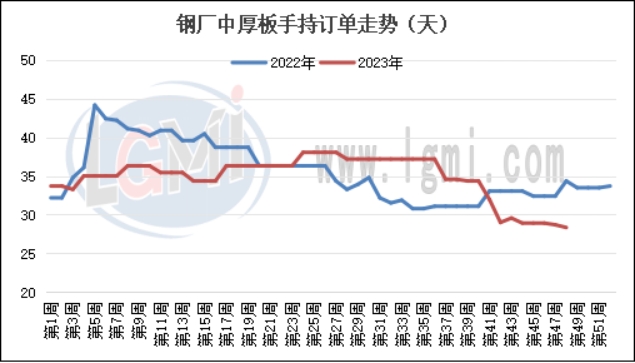 手持订单方面,据兰格云商平台监测的数据显示,11月份全国中厚板钢厂手持订单天数为29天,较10月份均值下降2天,同比下降4天,整体11月份的手持订单情况也较去年同期有明显的下移。