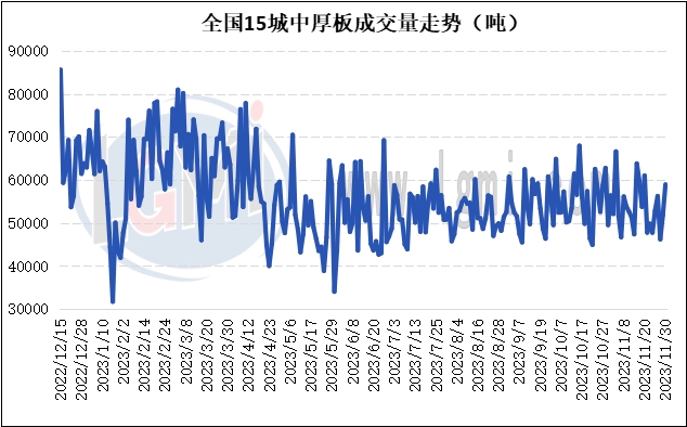 社会成交情况方面,据兰格云商平台监测的数据显示,11月全国中厚板月度日成交量均值在5.39万吨,较10月份均值下降0.13万吨,同比下降1.63万吨。而10月份中厚板的月度日均成交量同比去年同期下降1.47万吨。也就是说在2023年,进入四季度的整体市场成交情况也较2022年有一定活跃度的下降,这也是现货库存持续趴于高位的原因之一。