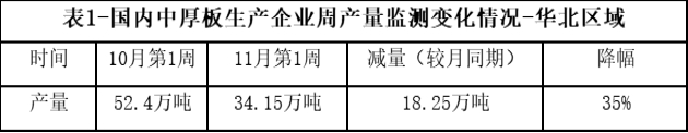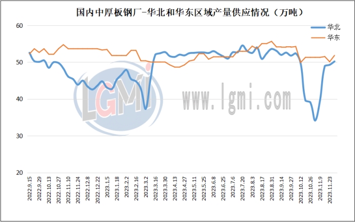 在中厚板产品价格快速下滑、生产亏损加剧的情况下,钢厂在产品结构调整上开始进行产品倾斜,中厚板轧线部分进入了检修状态,兰格钢铁网监测的中厚板轧线开工率自10月中旬开始连续四周下降,直到11月初下降到67%的年内低位水平;而从10月份的减量区域来看,主要集中在华北区域,华北区域的中厚板生产供应量由9月初的52.4万吨降到了11月初的34.15万吨,减量超三成。相比较,华东区域的中厚板钢厂在10月份整体的轧线开工率以及供应结构变化不大,表现相对平稳。