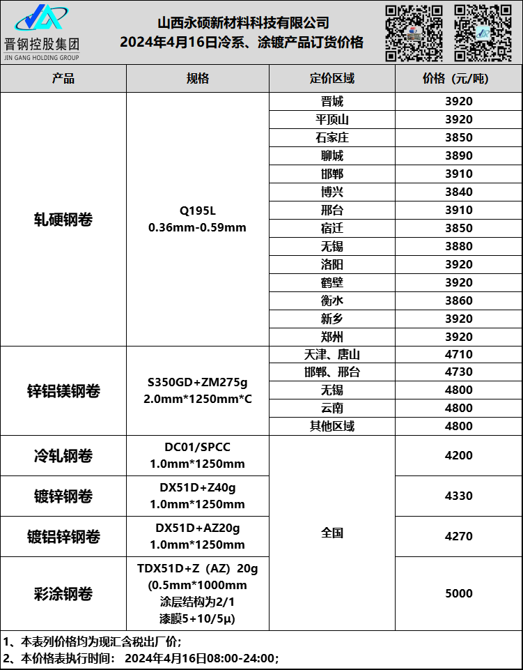 • 4月16日山西晋钢冷系 涂镀产品订货价格