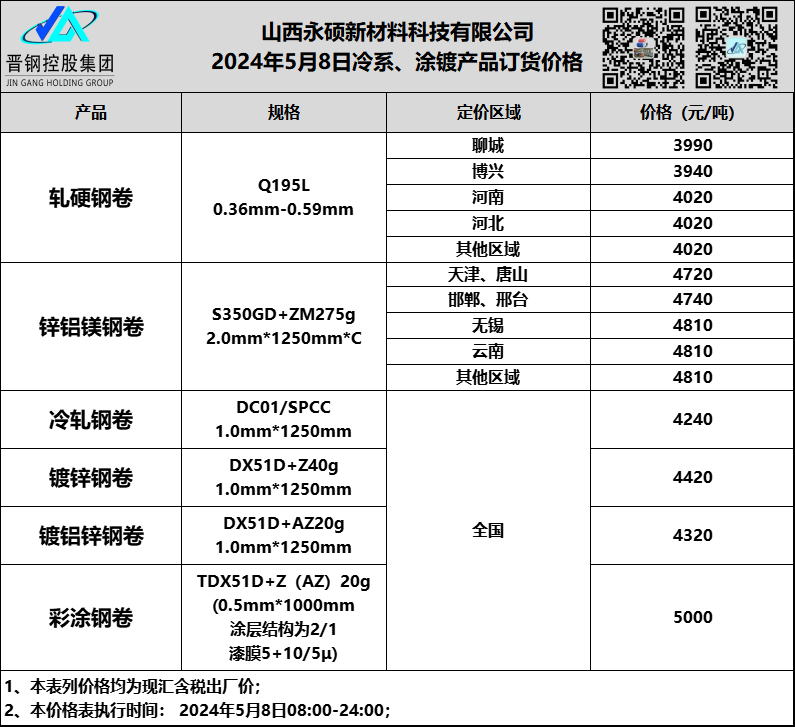 5月8日山西晋钢冷系 涂镀产品订货价格