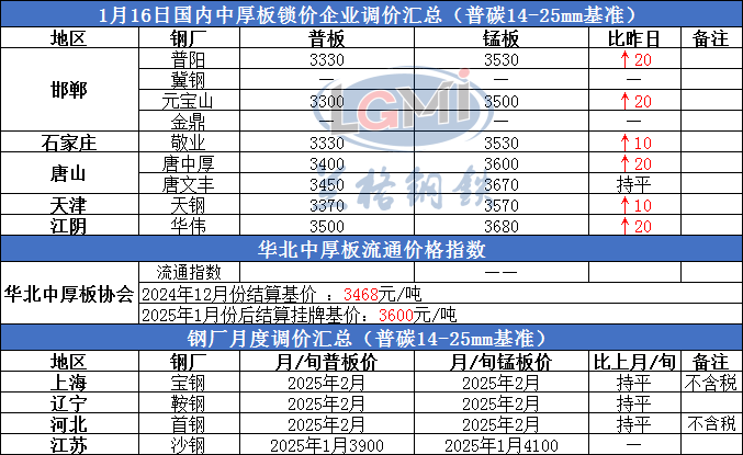 1月16日国内中厚板锁价企业调价汇总