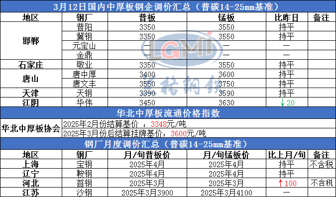 3月12日国内中厚板生产企业调价汇总