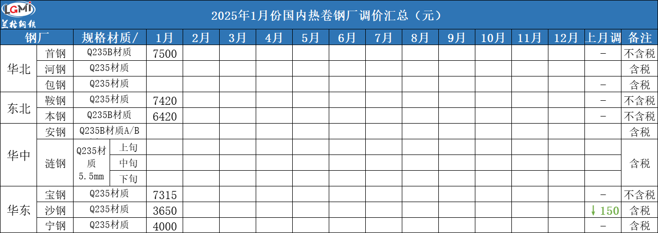 2025年1月份国内热卷钢厂调价汇总