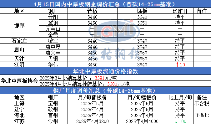 4月15日国内中厚板生产企业调价汇总