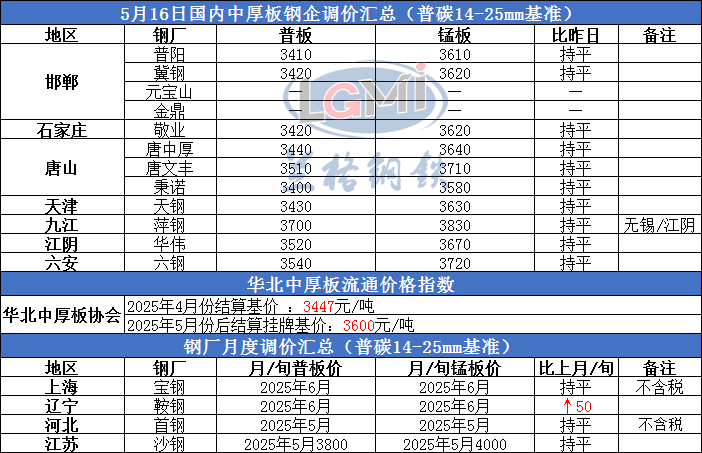 • 5月16日国内中厚板生产企业调价汇总