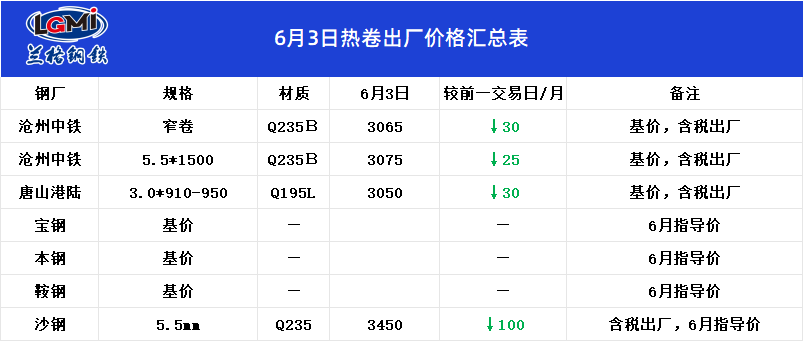 • 6月3日国内热卷出厂价格汇总